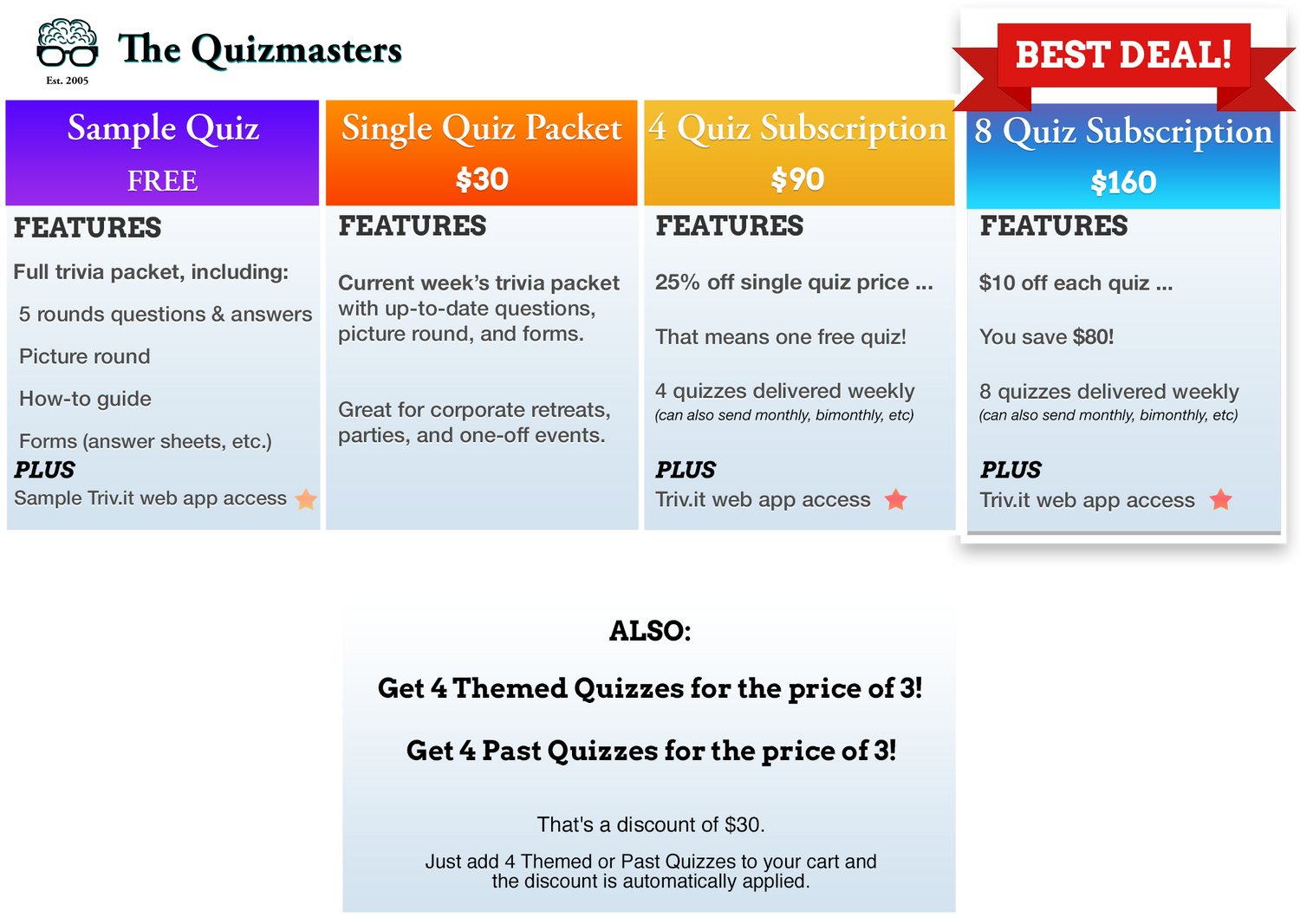 Each packet has everything you need to host a successful trivia night: 5 rounds of questions + answers, pic round, PowerPoint presentation of the quiz, step-by-step how-to guide, access to our trivia app Triv.it (subscribers only) + great customer support.